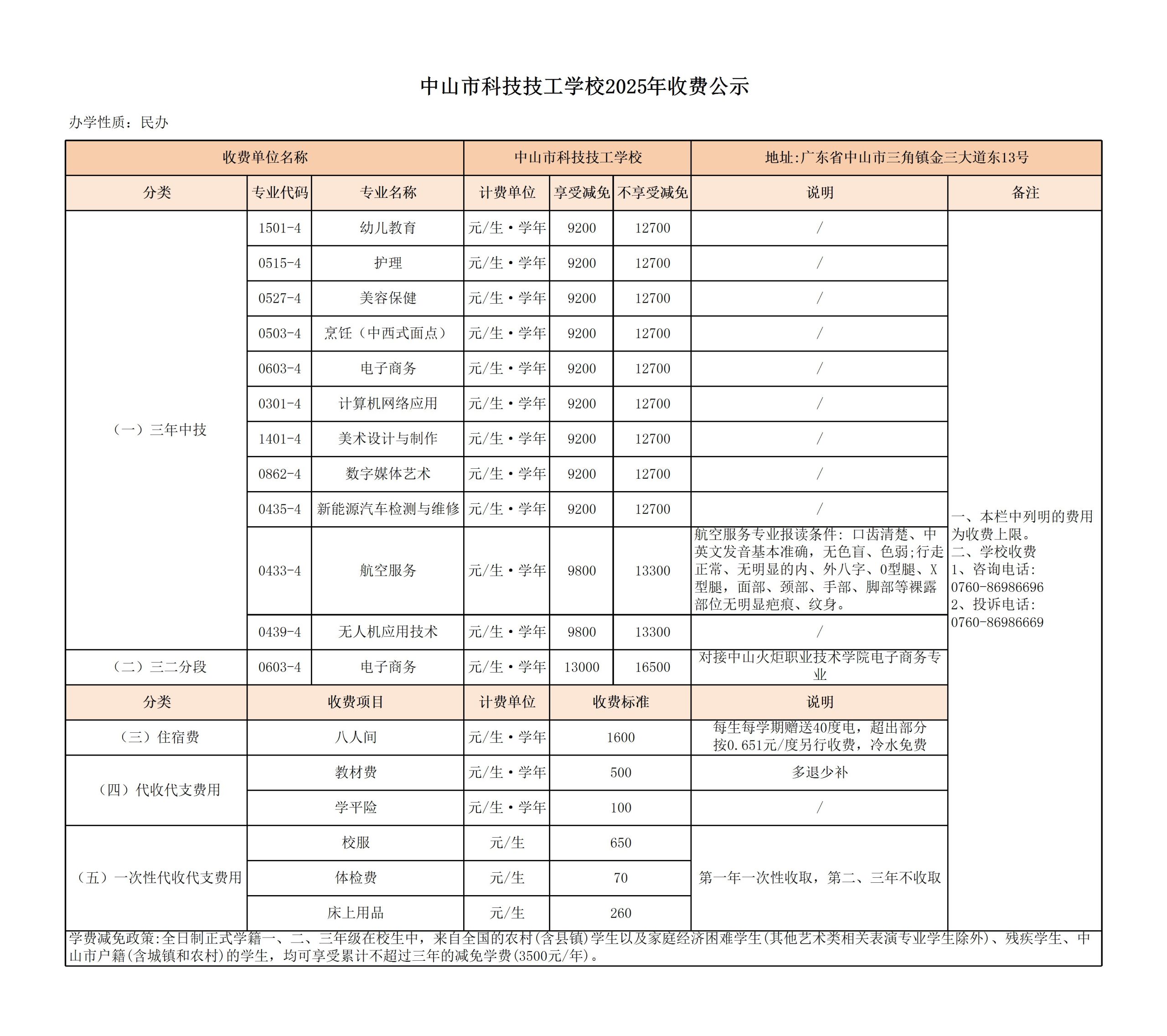 中山市科技技工学校2025年收费公示